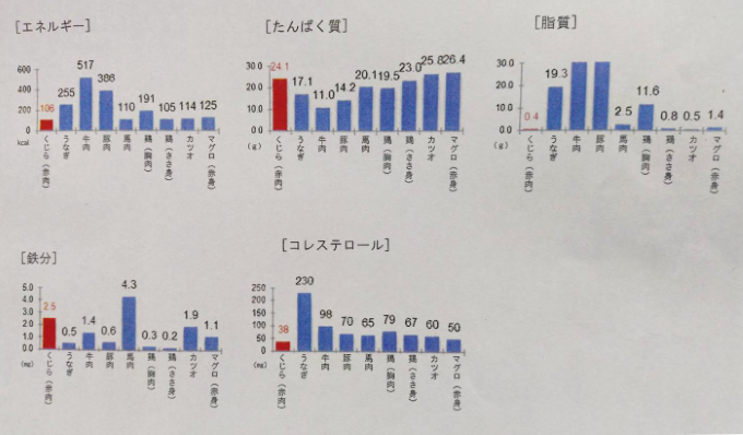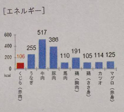 くじらの赤肉と、牛肉やうなぎなどの一般的に疲労回復に効果的と思われている食品の栄養成分を比較してみると、くじらの赤肉のカロリー(106kcal)は、牛肉の約1/5、豚肉の約1/3と低カロリーです。