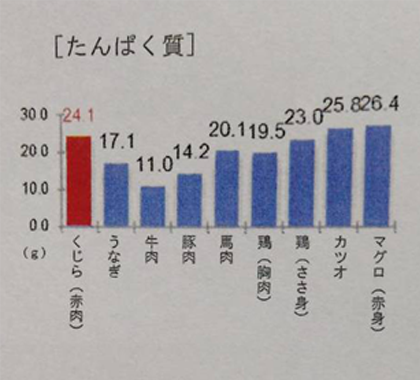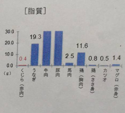 くじらの赤肉は、筋トレはダイエットに理想的なたんぱく源といわれる鶏のささみ(105kcal)と同等のカロリーですが、その脂肪分はさらに低く鶏ささみ(0.8g)の約半分です。