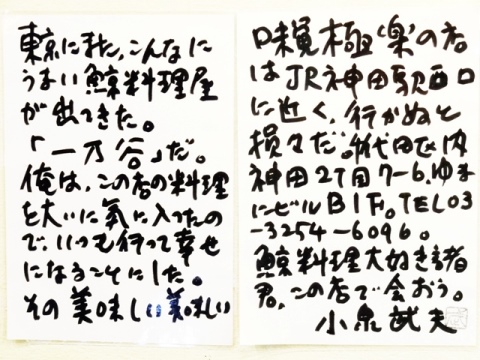 東京農行大学名誉教授であり「食に命を懸ける会」名誉会長でもある小泉武夫先生から一乃谷への思いと賛辞を直筆してくださいました。
